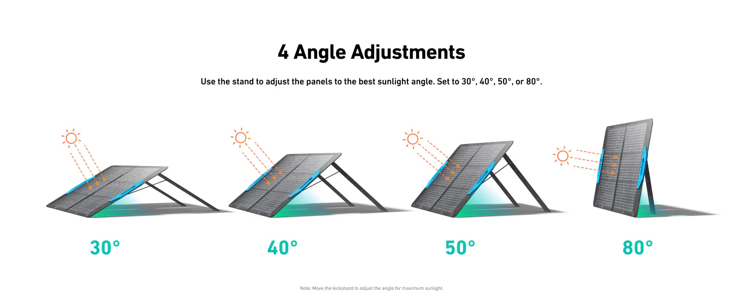 4 Set Angles for Max Sunlight Absorption: No matter where you are, the season, or time of day, you can maximize sunlight absorption. Easily switch between 30°, 40°, 50°, or 80° angles.